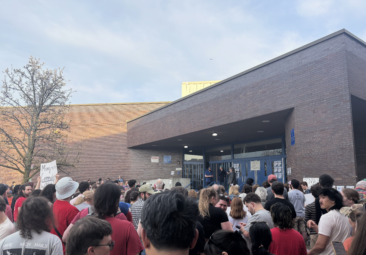 Allston-Brighton residents, city council members, and members of the State Senate gathered at the steps of the Jackson Mann Community Center on April 14, to protest a lack of funding for the community center and demand the city council allocate more funding towards renovation.